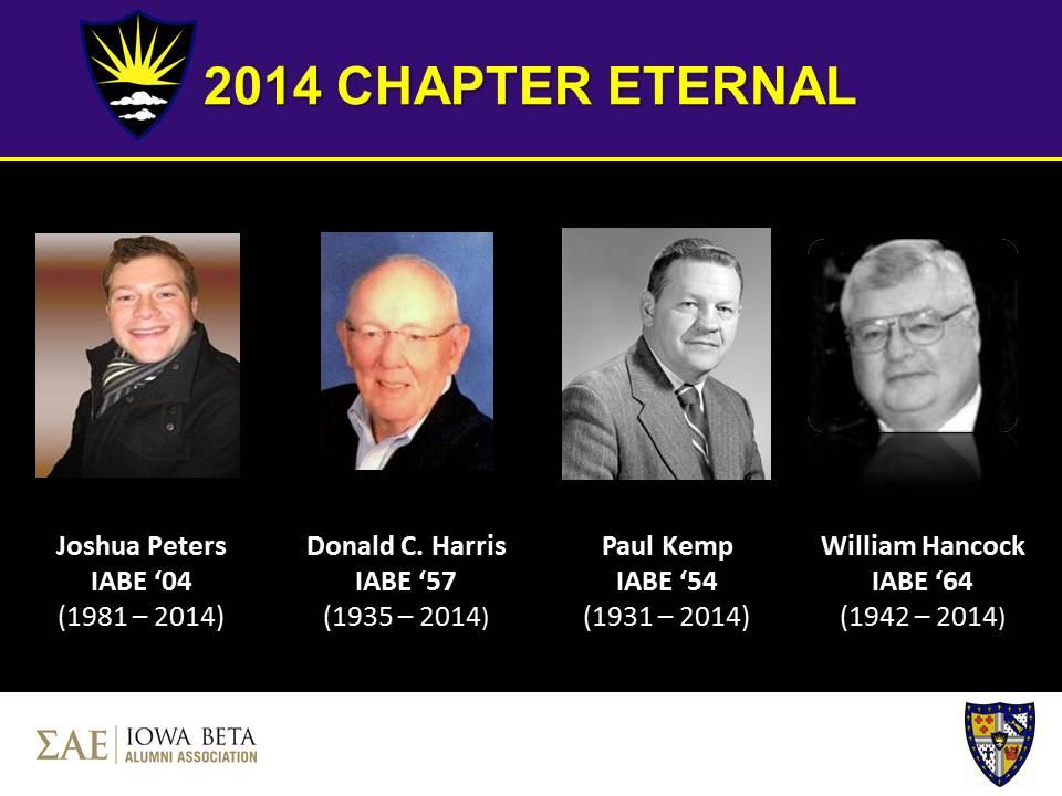 During the past year, death has claimed four Iowa Beta alumni brothers from our Mystic Circle. In order of their passing, those men are: